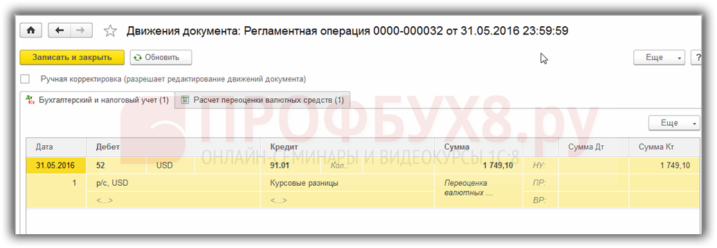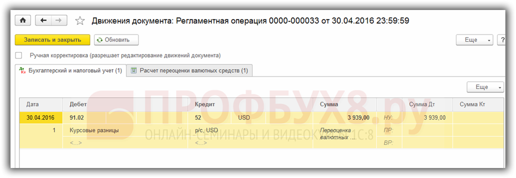 Что касается переоценки валюты в 1С 8.3 при совершении операции, то механизм аналогичен тому, что рассмотрели выше, только курс пересчета валюты берется согласно дня проведения операции: