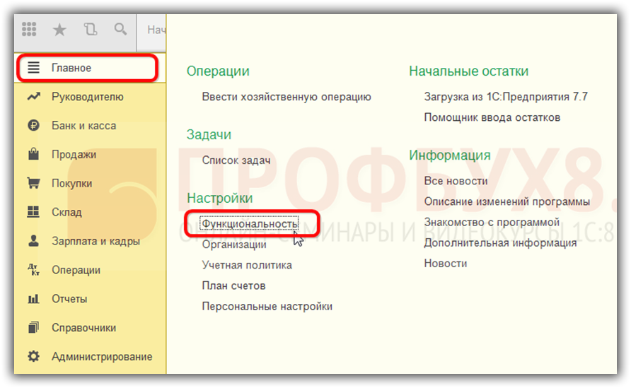 Чтобы иметь возможность вести валютный учет в программе 1С 8.3 при начале эксплуатации необходимо настроить Функциональность, позволяющую вести валютные операции. Меню Главное – Настройки – Функциональность: