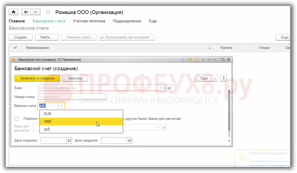 При наличии валютного банковского счета у предприятия, данные о нем необходимо внести в справочник Банковские счета организации: