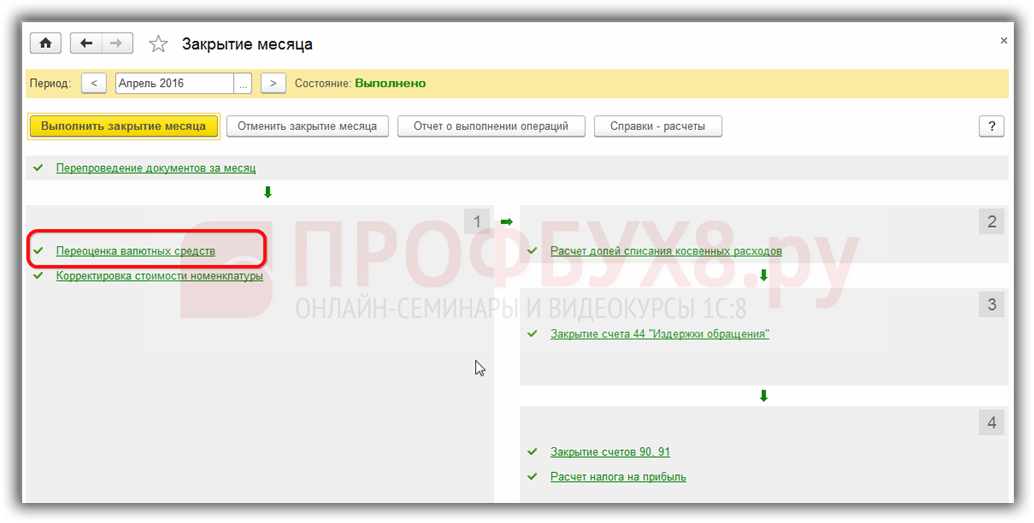 Для обычных предприятий ежедневный пересчет валютных остатков, как правило, не требуется. Поэтому переоценки и учет курсовых разниц выполняют, когда закрывают период (стандартно — месяц). То есть конец месяца в данном случае играет роль промежуточной «отчетной даты». Соответственно, при закрытии месяца нужно сделать и промежуточную переоценку валютных статей.
