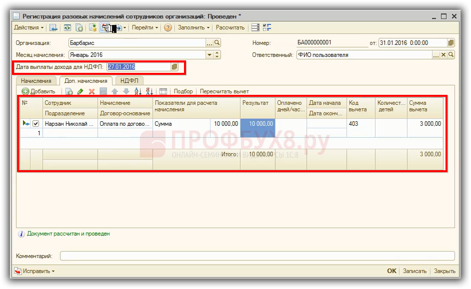В базе 1С ЗУП 2.5 (8.2) нет возможности в документе «Начисление зарплаты» указать дату выплаты. Поэтому доходы по договорам ГПХ по умолчанию регистрируются на последнее число месяца. Если выплата по договору ГПХ приходится на другой день, то регистрировать начисления по договорам следует с помощью документа «Регистрация разовых начислений сотрудников организаций». В данном документе есть возможность указать фактическую дату выплаты для 6-НДФЛ. На закладке «Доп. начисления» указывается