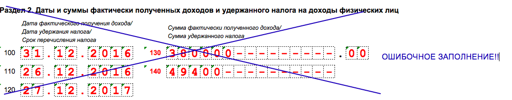 - расчет 6-НДФЛ за 4 квартал 2016 года, заполненный таким образом, не пройдет форматно-логический контроль и вернется с ошибкой «дата удержания налога не должна предшествовать дате фактической выплаты»;