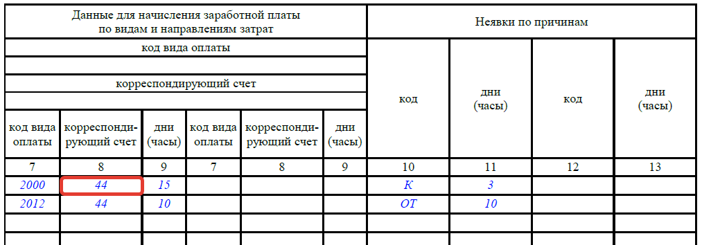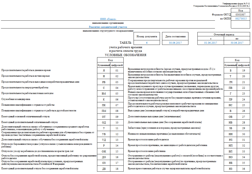 При заполнении применяется единая система обозначений. В табеле осуществляется учет отработанного времени в соответствии с правилом «для одной должности предназначается одна позиция»