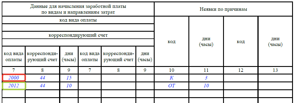 - Выплаты за отпускные дни (обозначается кодом 2012).