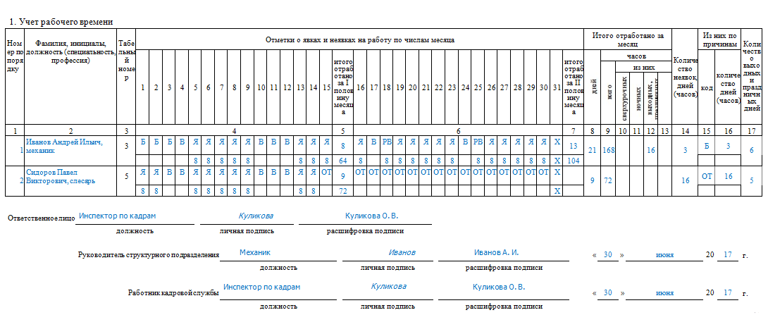 - Если коллега отпрашивается, и руководитель не возражает, то фиксируют только фактически отработанные часы (целым числом). Отсутствие обозначают пометкой «Я» или двумя цифрами «01».