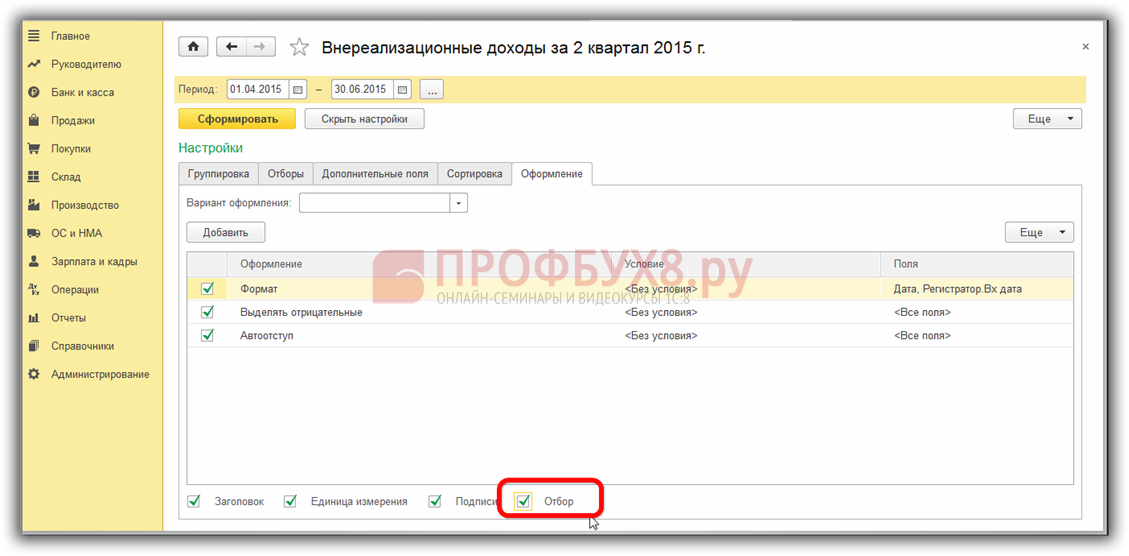Рассмотрим, какие настройки доступны внутри самих регистров. Как обычно, это Группировка, Отборы, Дополнительные поля, Сортировка, Оформление: