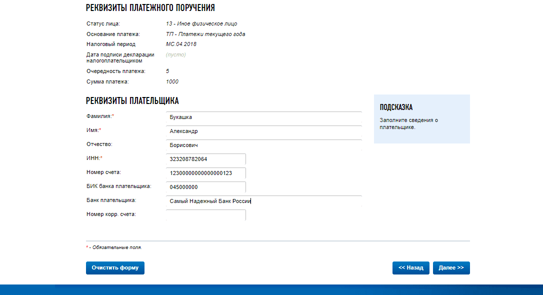 Шаг 10. Вносим реквизиты физического лица с помощью подсказок в правой части экрана.