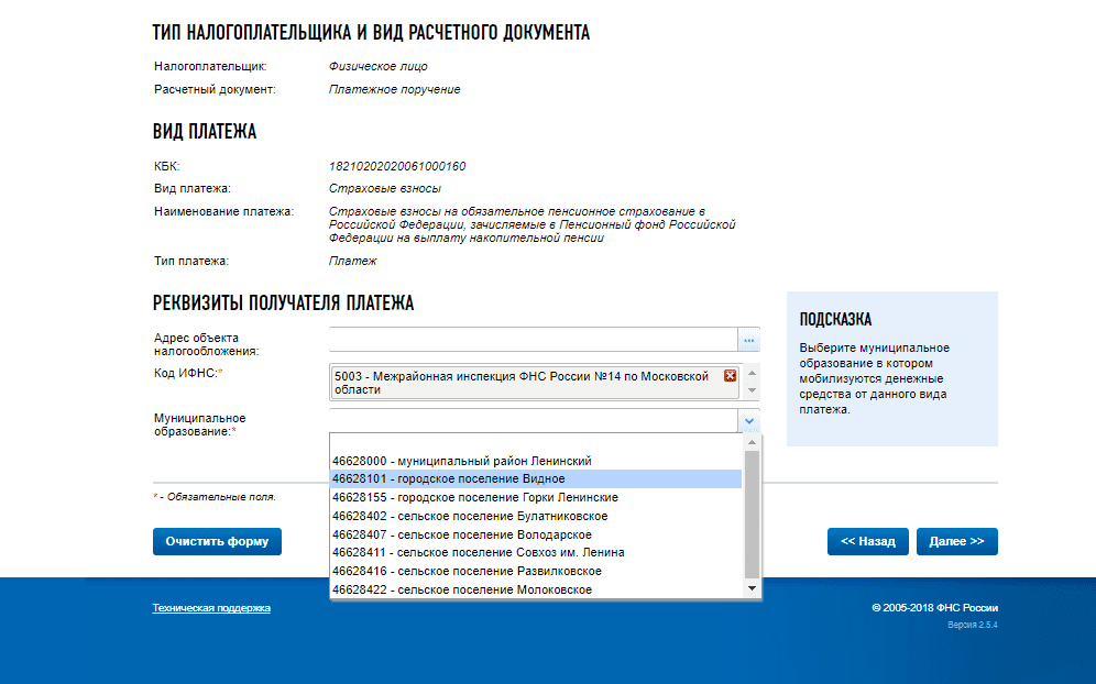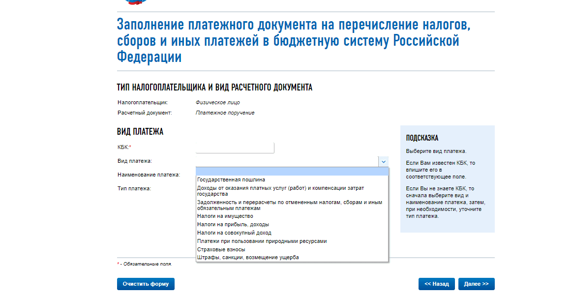 Шаг 3. Нажимаем «Далее» и переходим к следующему этапу. Теперь определяемся с видом платежа: здесь требуется ввести КБК, но если вы не знаете правильный код бюджетной классификации, то выберите сначала «Вид платежа».