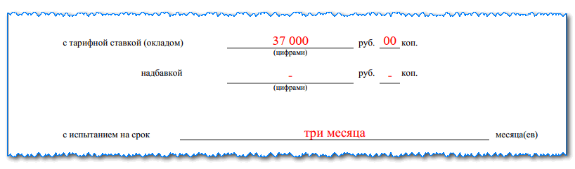 В следующей строке указывается испытательный срок, если он устанавливается для данного работника. В противном случае в этой строке ставится прочерк.