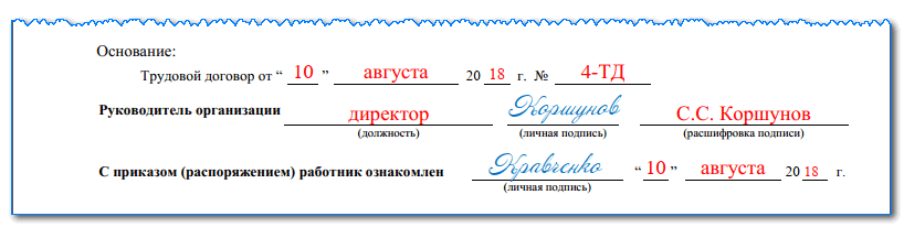 Заполненный образец приказа о принятии на срочную работу следует продемонстрировать работнику для ознакомления.