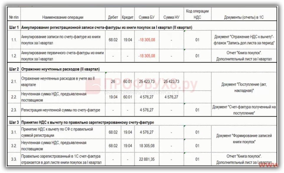 При регистрации счета-фактуры в книге покупок допущена ошибка по графе 15 «Стоимость покупок по СФ». Поэтому неправильная запись по счету-фактуре аннулируется из книги покупок за 1 квартал через дополнительный лист.