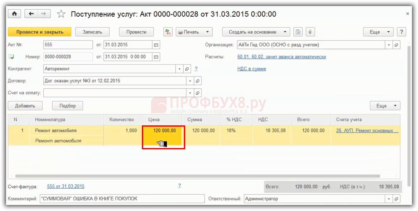 Далее необходимо решить в каком периоде внести исправление в 1С 8.3. С точки зрения НУ и БУ сумма разницы в 30 000 рублей включается в расходы в том периоде, когда обнаружена ошибка. В документе указываем те же номер Акта и дату документа: