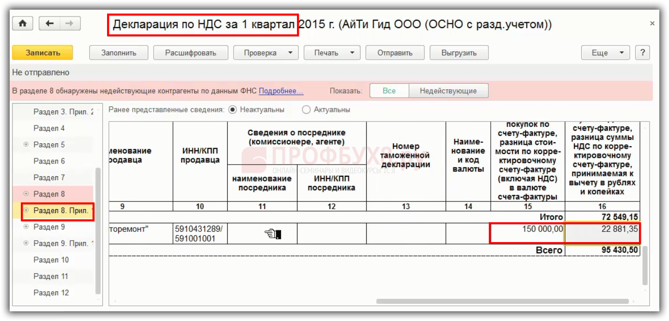 Допустим, во 2 квартале обнаружили, что в 1 квартале 2015 года из-за невнимательности бухгалтера первичные документы и счет-фактура на приобретение товаров отражены на меньшую сумму 120 000 рублей, а должно быть 150 000 рублей: