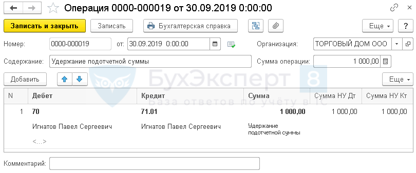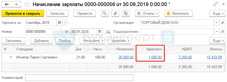 - Сумма — сумма удержания, в нашем примере 1 000 руб.