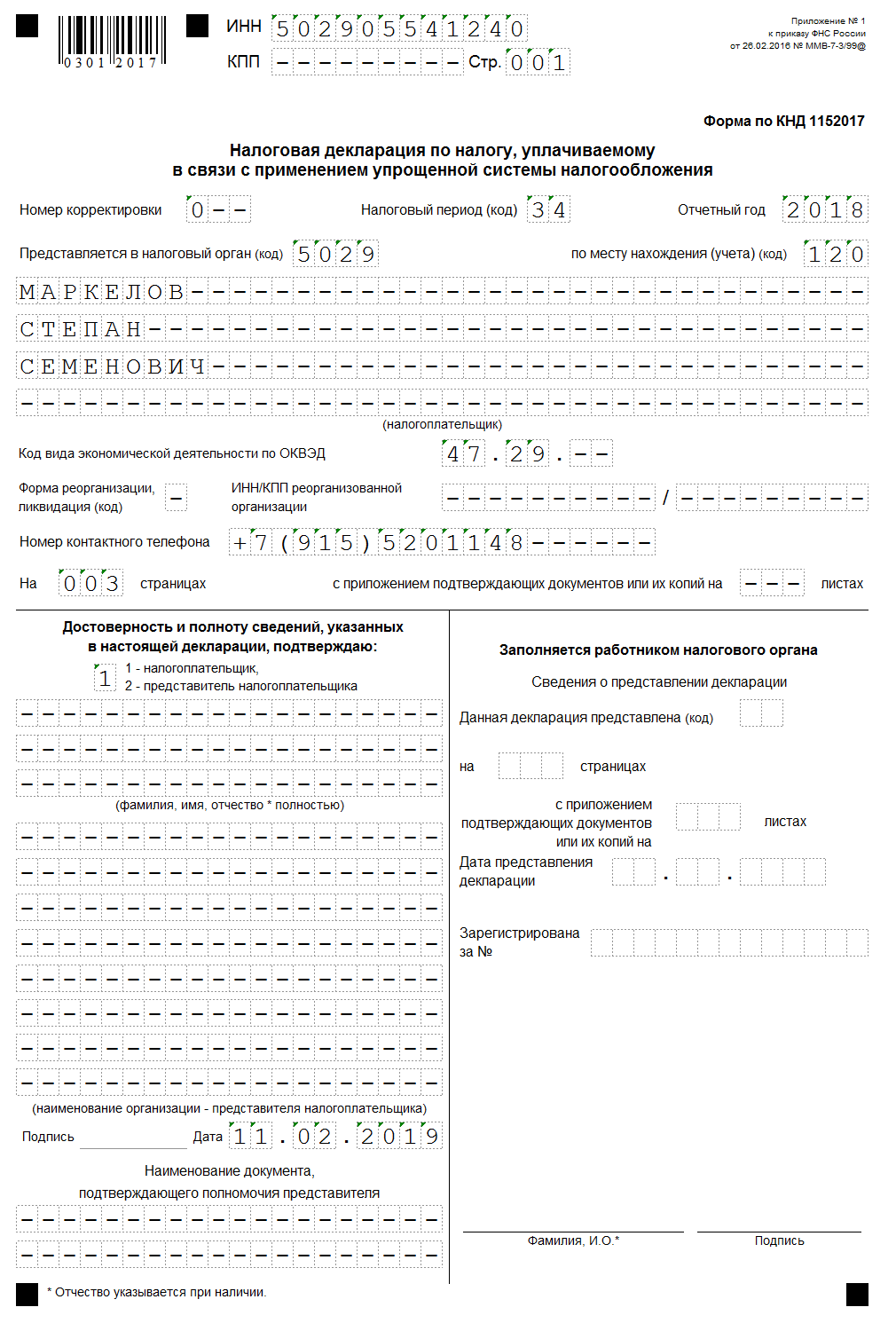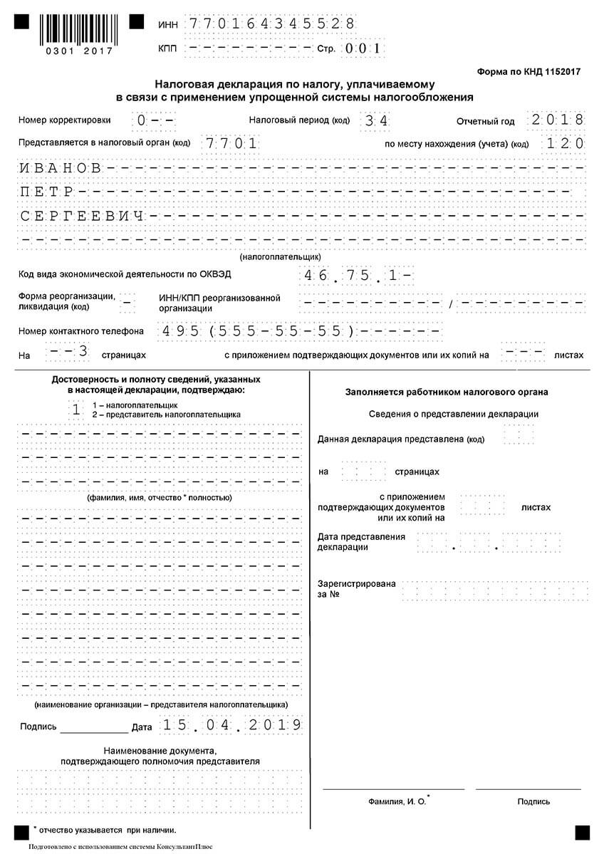 Образец заполнения декларации по УСН 6% для ИП