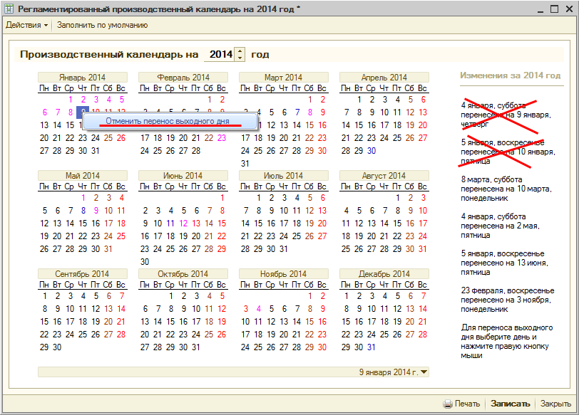 проверить и при необходимости отменить перенос неверно перенесенных вручную дней. Отменить перенос можно нажатием правой кнопкой мыши на «ошибочном» дне и