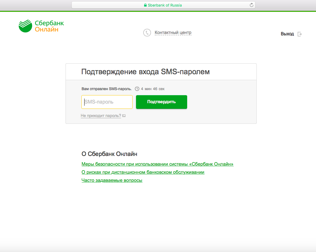 - ввести пароль, который будет отправлен системой на мобильный телефон;