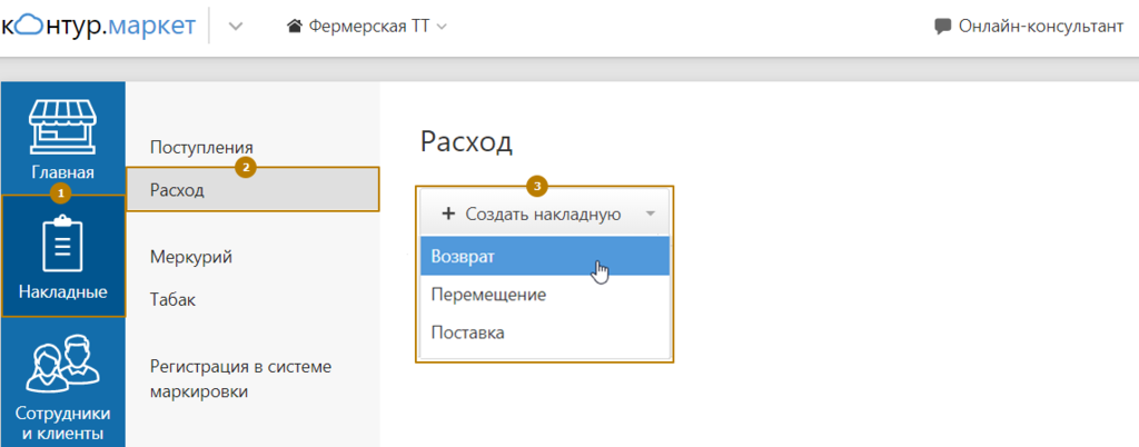 1. Выберите подраздел «Расход», нажмите «Создать накладную» и кликните «Возврат».