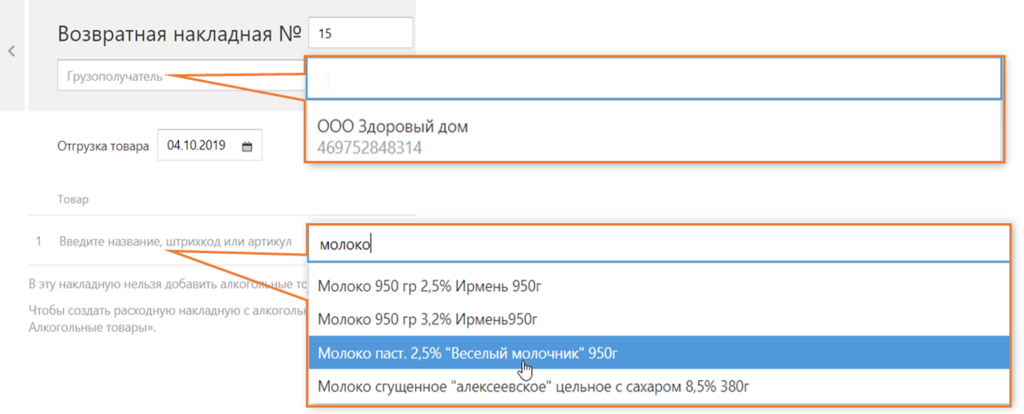 2. Впишите номер документа и выберите дату на календаре. Кликните в поле «Грузополучатель» и выберите нужную компанию в открывшемся списке. Чтобы добавить товар, кликните в пустое поле и начните вводить название, штрихкод или артикул. Сервис предложит выбрать нужный вариант из найденных.