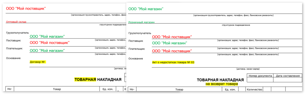 Обратите внимание на отличия в шапке приходной и возвратной накладной:
