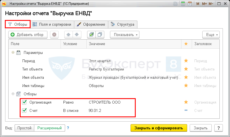 После завершения настройки нажмите кнопку Закрыть и сформировать. Программа сформирует отчет по заданной настройками форме.
