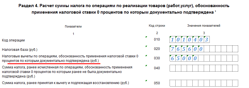 ООО «Феникс» отгрузило товар по договору 17 января 2016 года на сумму 10 000 долларов, курс на эту дату составлял – 76,56. Цена экспортной поставки содержит «входной НДС» — 65 000 рублей. Все нужные документы организация собрала 20 марта. При подаче декларации 20 апреля 2016 года заполняется раздел 4 (1 отчетный квартал). Указанная в графе 030 цифра равна итоговой сумме уменьшения налога, и влияет на расчет граф 040 и 050 раздела 1. Код 1010403 соответствует НДС 18% (1010404 – 10%).
