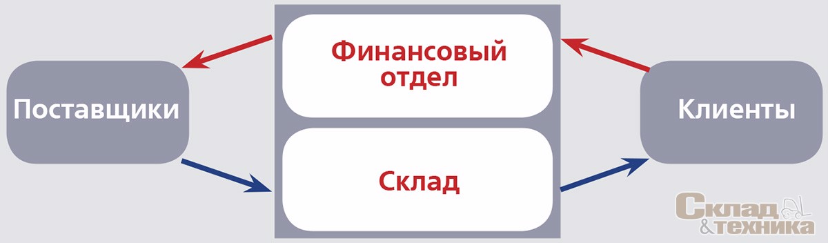 Красные линии обозначают финансовые потоки, синие – материальные (товарные). Здесь видно, что сначала финансовые потоки направляются к поставщикам, затем они возвращаются назад, на склад фирмы, но уже в виде товаров. С другой стороны, материальные потоки, уходящие к клиентам, возвращаются в компанию в виде финансовых потоков. Данная схема весьма условна, так как она не отражает, к примеру, всей последовательности структур, через которые проходят эти потоки: здесь не обозначен коммерческий отдел, без которого весь этот «круговорот» становится просто невозможным. Однако она вполне наглядно демонстрирует роль складского хозяйства.