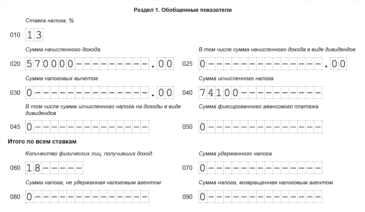 - в строке 020 – всю начисленную зарплату вместе с НДФЛ;