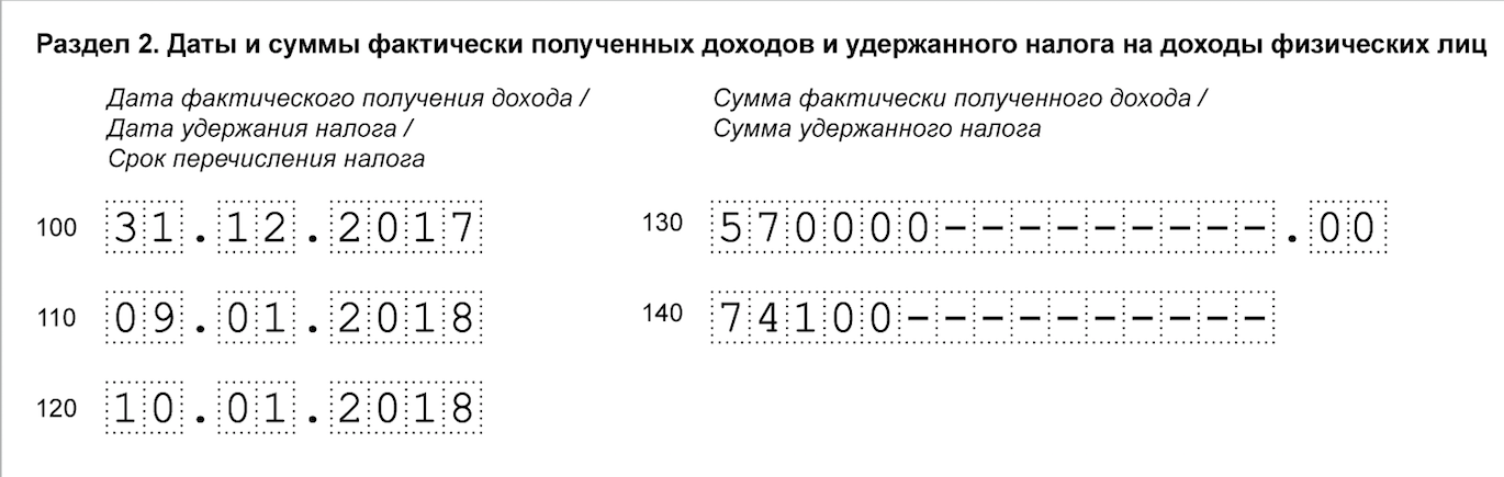 Пример: Зарплата за декабрь – 570 000 руб., НДФЛ – 74 100 руб. 09.01.2018 выплачена зарплата за вторую половину декабря и перечислен НДФЛ в бюджет. В 6-НДФЛ за 2017 г. декабрьская зарплата отражена так.
