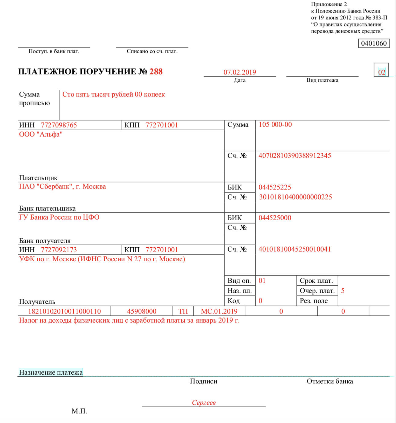 Заполненное по всем правилам платежное поручение по НДФЛ образца 2020 года должно выглядеть так:
