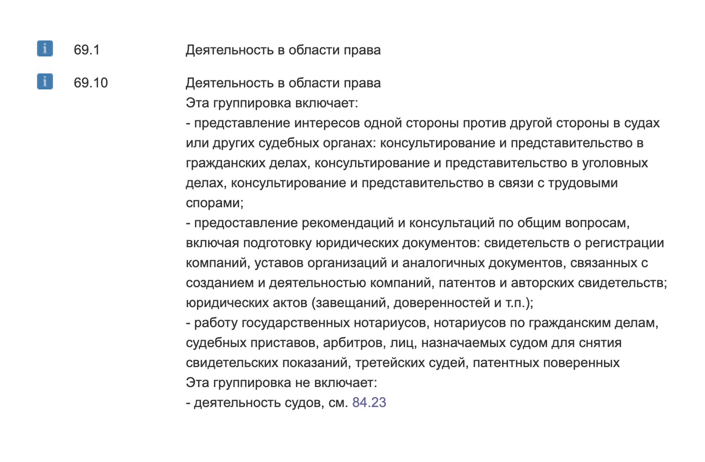 Например, юрист проводит консультации. Ищем раздел или класс о праве — 69 «Деятельность в области права и бухгалтерского учета».