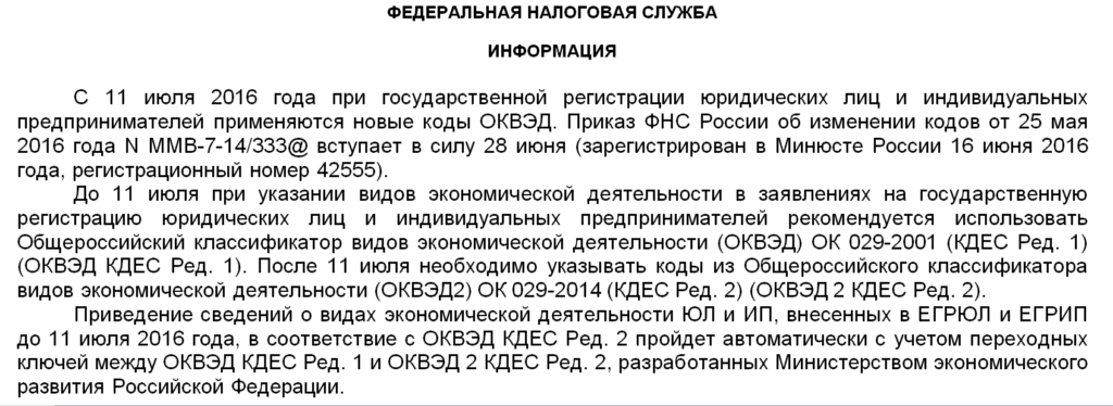 Обратите внимание! С 11 июля 2016 года для государственной регистрации применяется 3 классификатор — ОКВЭД2 (ОК 029-2014)