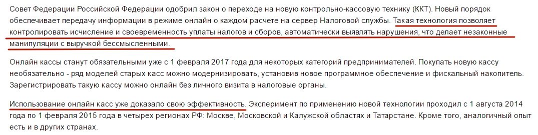 Заметим, что некоторые организации и ИП уже протестировали онлайн кассы в рамках пилотного проекта, проходившего в Москве, Московской и Калужской областях и Татарстане. Налоговики сочли пилотный проект удачным и посчитали, что внедрение онлайн касс для магазинов по всей стране позволит вывести из тени продажи, которые продавцами никак не фиксируются и, как следствие, бюджет недополучает налоги. Вот официальная информация с сайта ФНС: