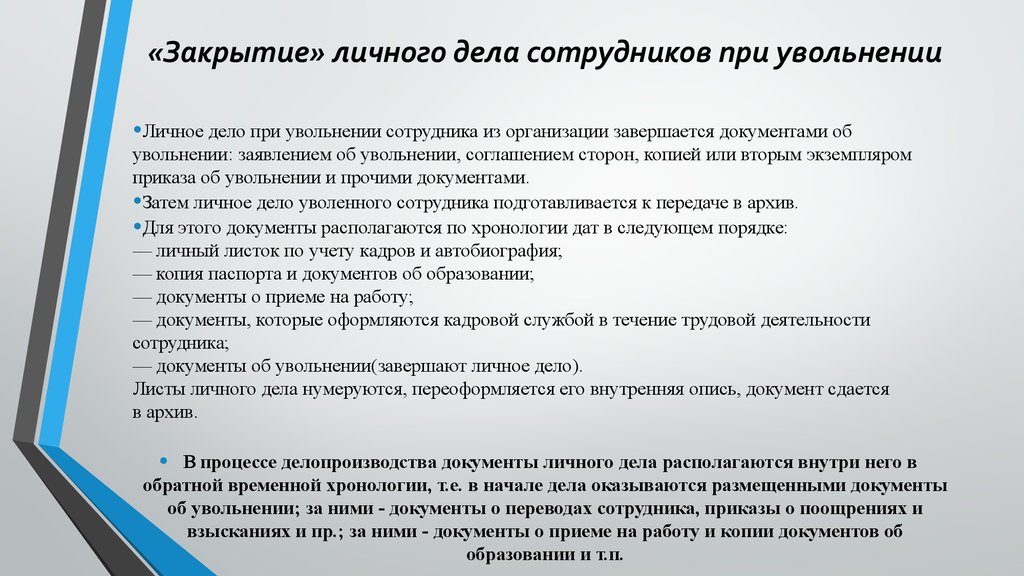 Итак, после определения списка бумаг, хранящихся в личном деле сотрудника, стоит отметить и тот факт, что так как срок действия каждого документа может отличаться – срок хранения бумаг в личном деле работника определяется для всей папки. Так, на протяжении 3 лет после увольнения сотрудника – они остаются храниться в отделе кадров, после чего передаются на хранение в архив на установленный законом срок.