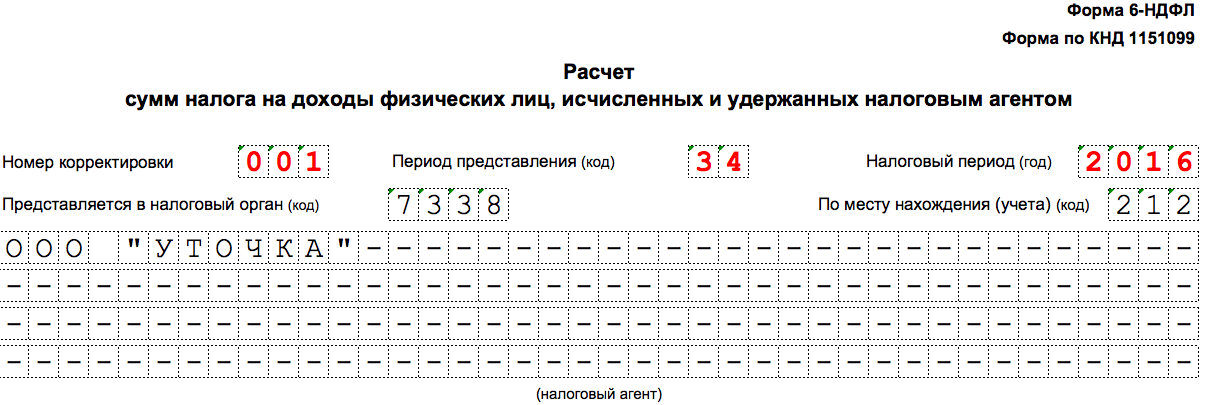 Также заметим, что при составлении корректирующей формы 6-стоит уделять значение показателю «Номер корректировки». Напомним, что при составлении первичной формы 6-НДФЛ в этой строке указывается «000». При составлении корректировочного Расчета необходимо указать «001». Если ошибка исправляется уже второй раз — «002» и т.д.