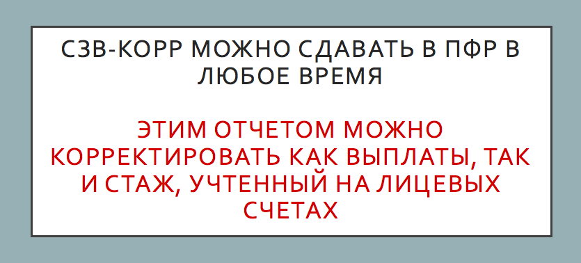 Отправляйте отчет СЗВ-КОРР в органы ПФР в любое время. Не нужно дожидаться, когда придет срок сдачи сведений о стаже за 2017 год. Также см. «Форма СЗВ-СТАЖ: как заполнить и сдать новую форму для годовой отчетности в ПФР». Как мы уже сказали, прежде корректирующие индивидуальные сведения можно было сдать только с текущей отчетностью РСВ-1. С 4 марта 2017 года такого подхода не существует.