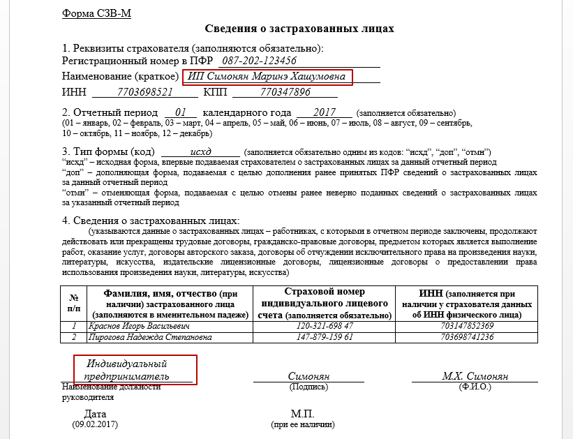 Далее вашему вниманию – образец заполнения СЗВ-М для ИП.