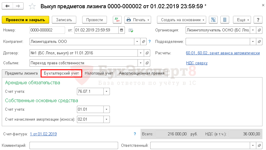 Отражение выкупа объекта зависит от того, на чьем балансе числится объект. Если он состоит у арендодателя, то составляется несколько записей. Списание ценности с баланса прописывается как КТ001. Отражение НДС по выкупаемому продукту указывается как ДТ19КТ60.