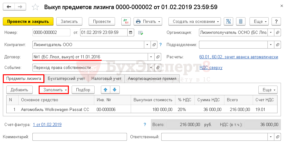 На вкладке Предметы лизинга по кнопке Заполнить в документе отразите основные средства, полученные в лизинг по указанному договору.