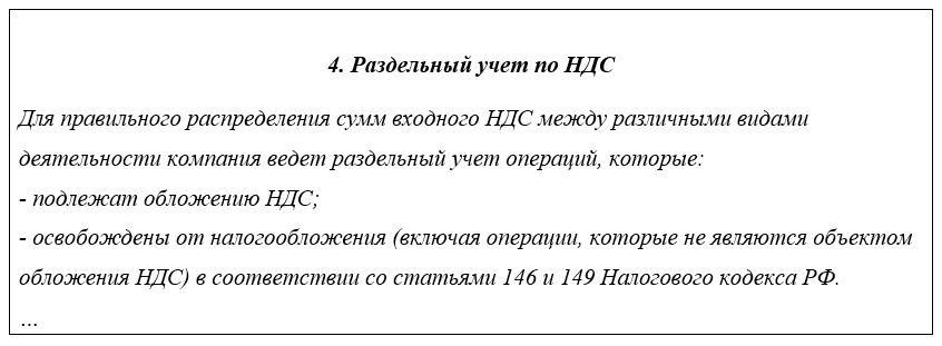 Отдельный раздел (подраздел) учетной политики имеет смысл посвятить раздельному учету операций, облагаемых и необлагаемых НДС. В частности, можно указать следующее: