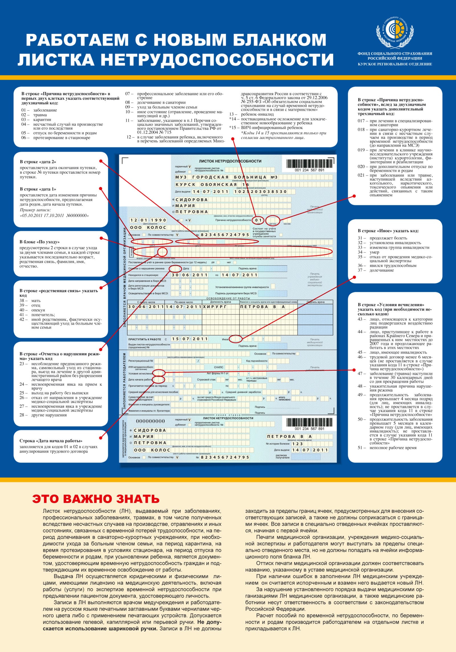Основная часть информации в больничном листе вносится с помощью кодов. Все данные считываются автоматически. Поэтому при наличии ошибок в бланке, некорректно или неаккуратно заполненных данных электронное устройство не сможет обработать данные.