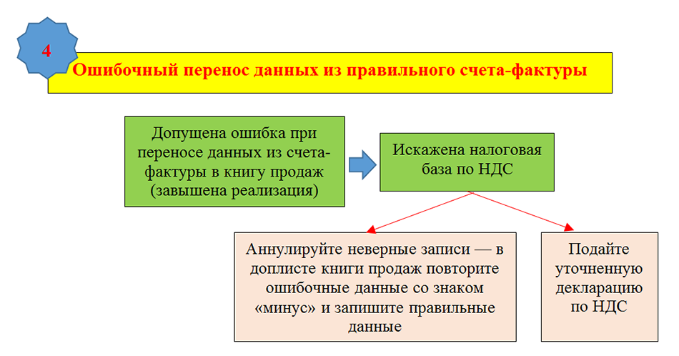 Нередко причиной появления ошибок в счетах-фактурах, книгах покупок и продаж и, как следствие, в декларации по НДС является банальная невнимательность исполнителей. Тогда из счета-фактуры, полностью соответствующего нормам НК РФ, в книгу покупок или книгу продаж попадают неточные (искаженные) данные. Последствия такой невнимательности зависят от того, как быстро ошибки технического свойства будут выявлены самим налогоплательщиком: