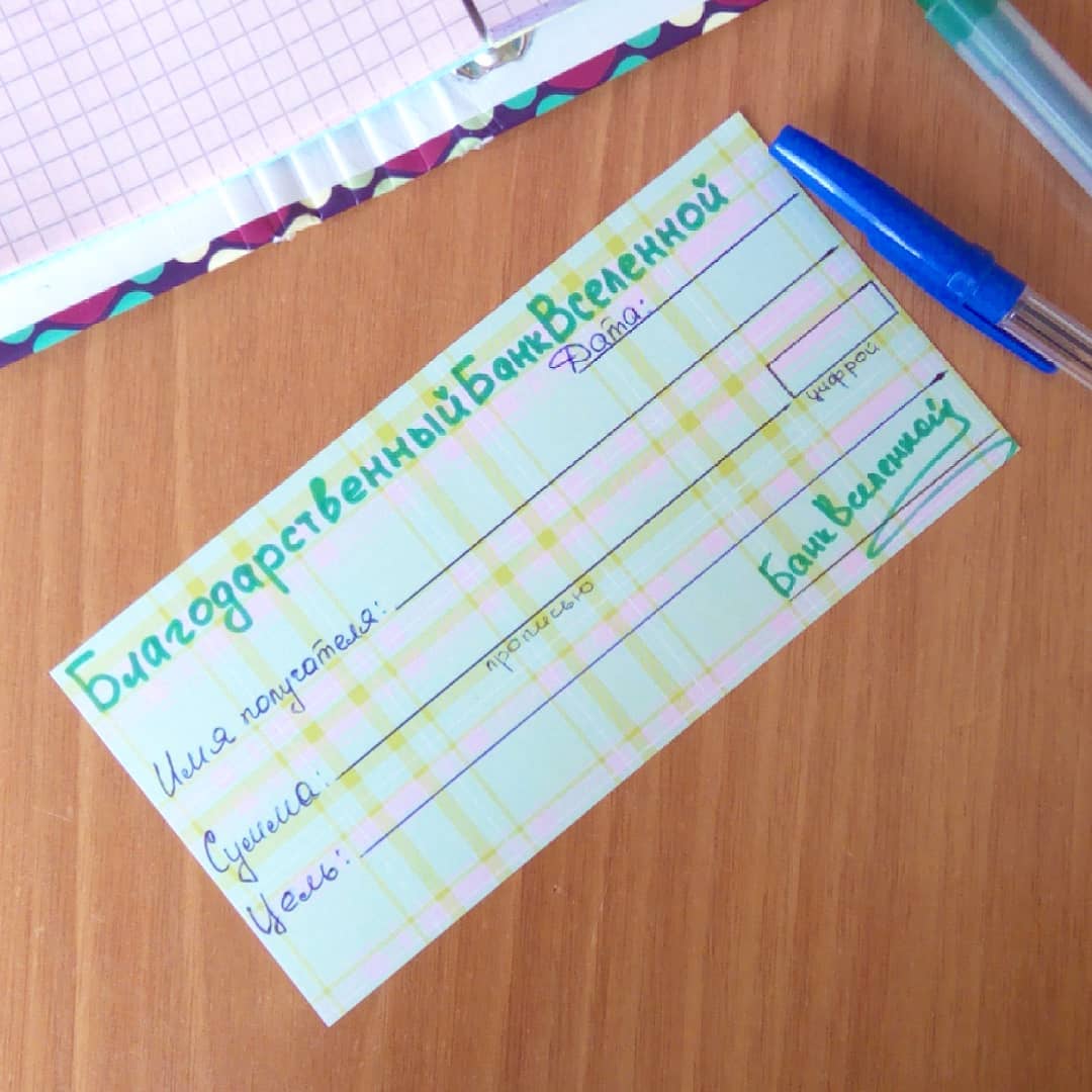 Если визуализировать Вселенную как родителя, можно представить, что у него, конечно же, есть свой банковский счет или даже собственный банк. В этом случае любой человек может обратиться к “маме”, как ребенок, попросив о карманных деньгах. В “Банк Вселенной” направляется специально заполненный “Чек изобилия”, с помощью которого и будут оплачены все желания “ребенка”.