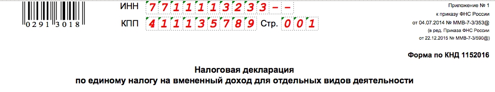 Сверху титульного листа (и каждого листа декларации) покажите ИНН и КПП компании. Причем вписывать КПП, касающийся организации по месту постановки на учет в качестве плательщика ЕНВД (в пятой и шестой позициях КПП должны быть цифры 35). Предположим, что в ИФНС, куда представляется декларация по ЕНВД за 4 квартал 2016 года, организация состоит на учете по двум основаниям: по местонахождению обособленного подразделения и по месту ведения деятельности, облагаемой ЕНВД. Тогда в декларации покажите не тот КПП, который присвоен организации по местонахождению обособленного подразделения, а тот, который присвоен фирме как плательщику ЕНВД (подп. 1 п. 3.2 Порядка, утв. Приказом ФНС России от 04.07.2014 № ММВ-7-3/353).