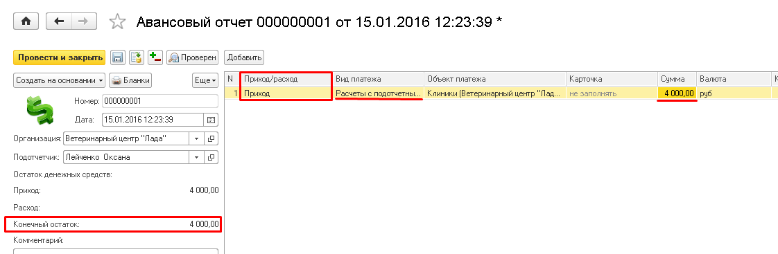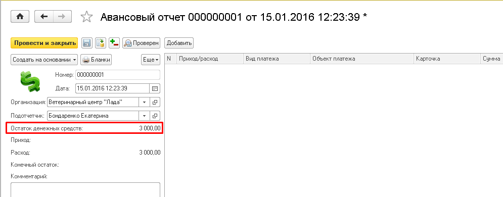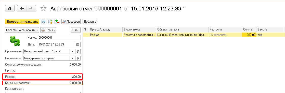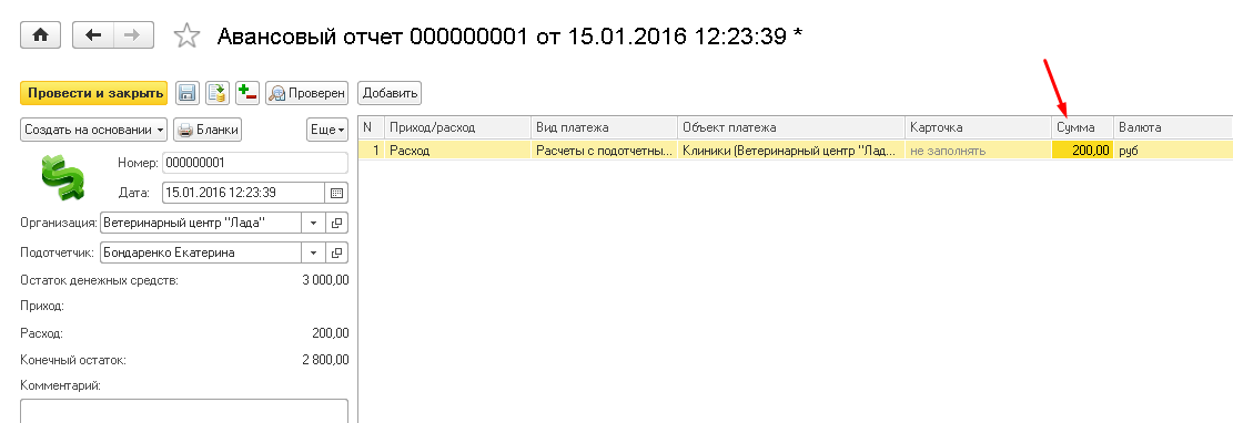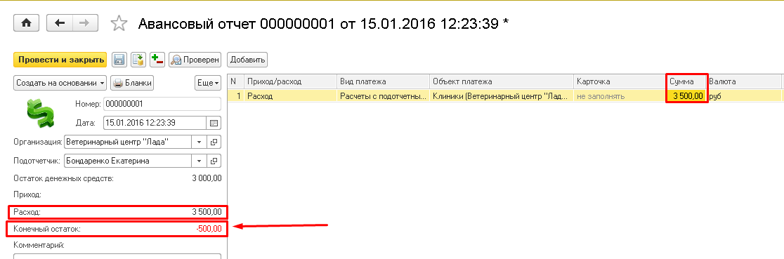 Рис.34 Отражение перерасхода средств выданных в авансовом отчете