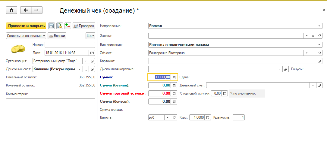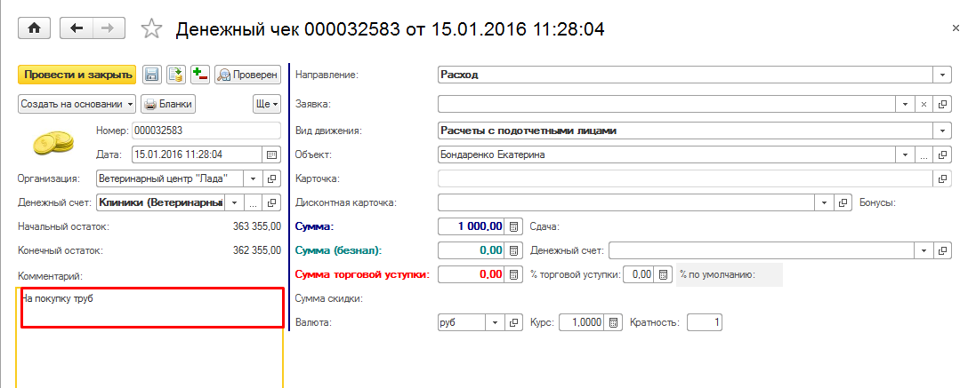 Комментарий служит для дополнительной информации по выданным деньгам из кассы под отчет. Это поле не является обязательным для заполнения (Рис.10).