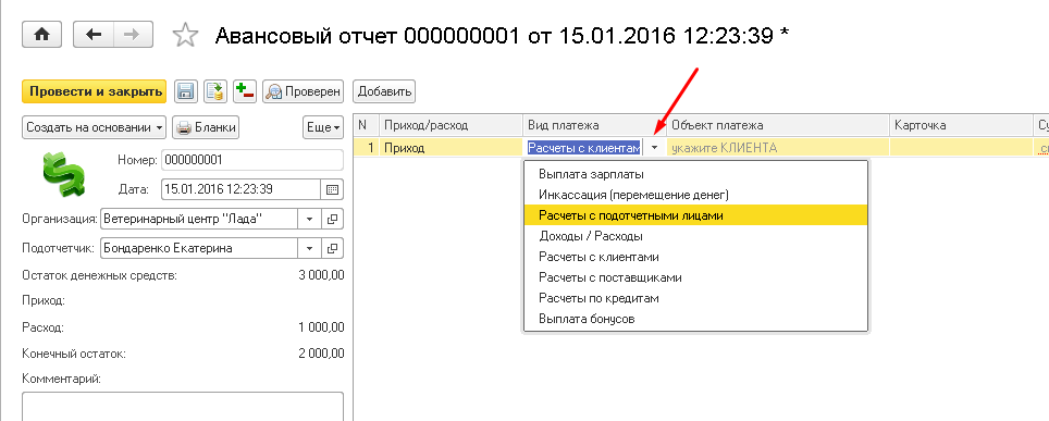 Вид движения — Расчеты с подотчетными лицами из списка (Рис.30).
