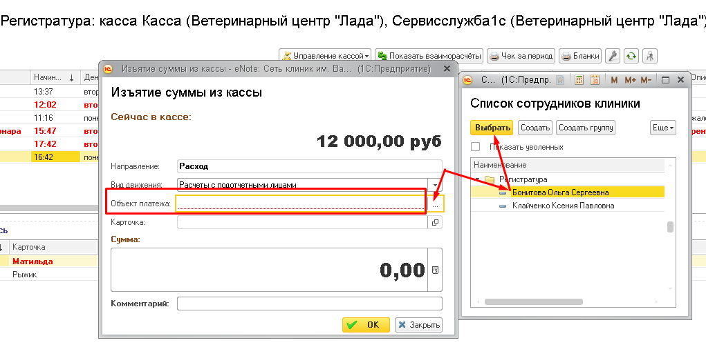 Рис.20 Выбираем объект платежа из списка сотрудников клиники