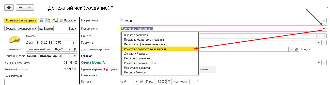 Вид движения денег — выбираем Расчеты с подотчетными лицами (Рис.5).