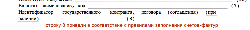 Как мы уже сказали, с 1 июля 2017 года в форме счета-фактуре появилась графа 8, в которой нужно указывать идентификатор государственного контракта. С 1 октября 2017 года в строке 8 появится уточнение о необходимости заполнять ее при наличии идентификатора госконтракта. Это изменение техническое, ведь правила заполнения счета-фактуры это уже предусматривают.